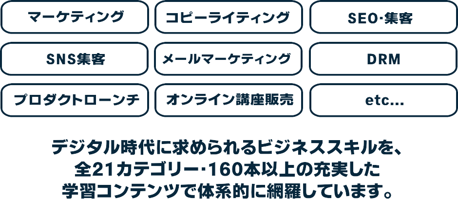 副業プロ養成プログラムは、マーケティング、SEO・ブログ運営、SNS集客、コピーライティング、メールマーケティング、動画制作、オンライン講座販売、プロダクトローンチ、各種ツール活用までデジタル時代に必要なビジネススキルを 21カテゴリー・160本以上の動画コンテンツをご用意しています。